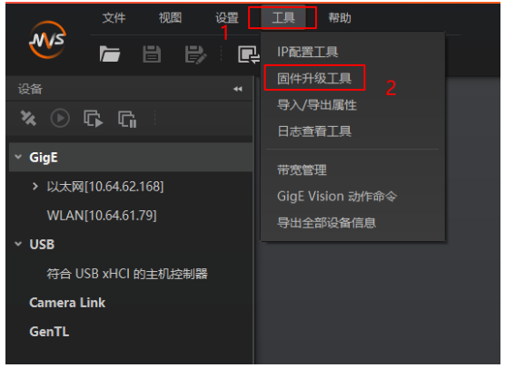 步驟 2 打開(kāi) MVS->工具->固件升級(jí)工具,或者從開(kāi)始菜單中進(jìn)入固件升級(jí)工具;